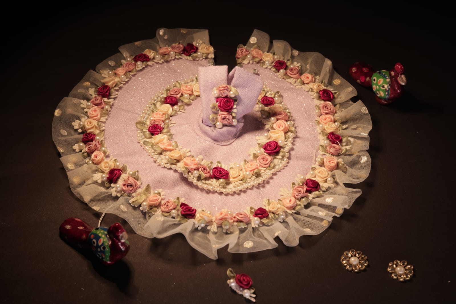 A beautifully handcrafted lavender Laddu Gopal poshak adorned with premium rose flowers, pearls, and soft net frill. Designed to give Bal Gopal a divine and elegant look for daily darshan and special festivals.