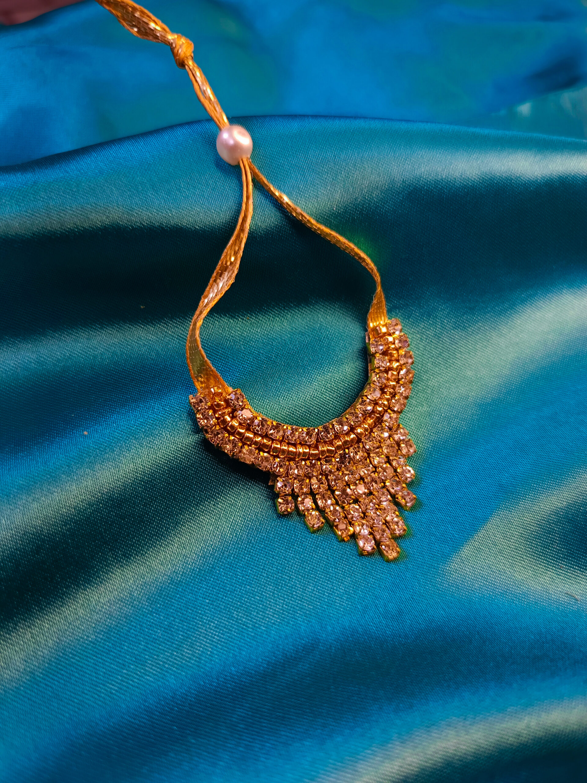This necklace embraces simplicity and tradition with embedded golden beads and rhinestone waterfall designs and a smooth finish, ideal for medium-size Gopal idols.