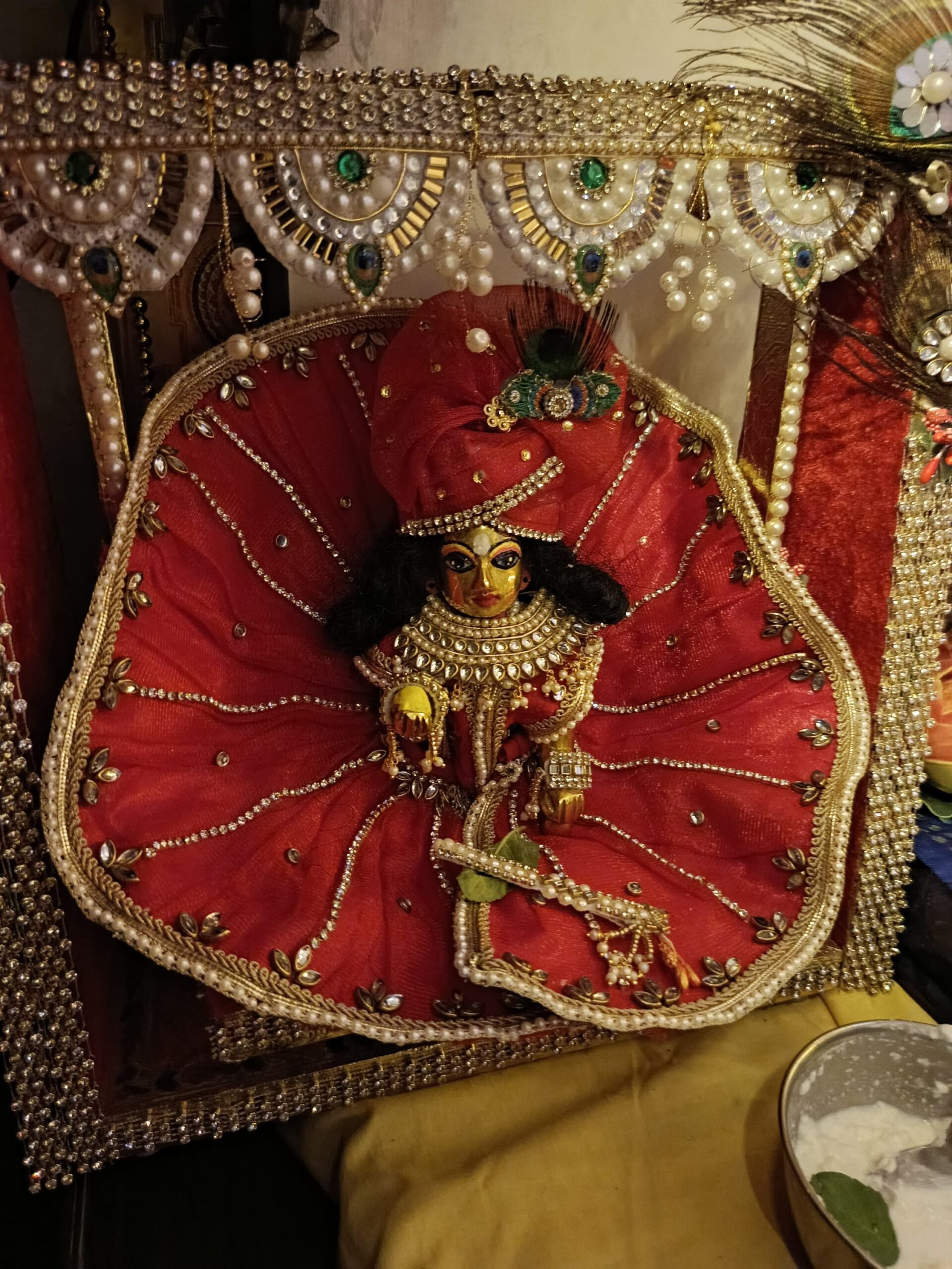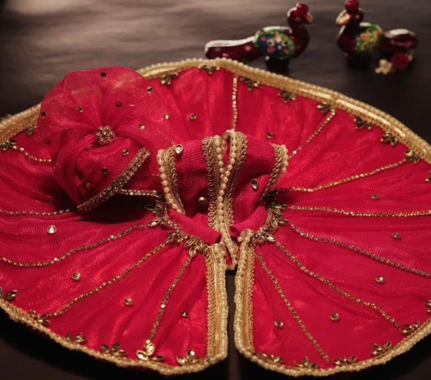 Elegant red Laddu Gopal poshak adorned with golden lace and delicate stone work.❤️✨