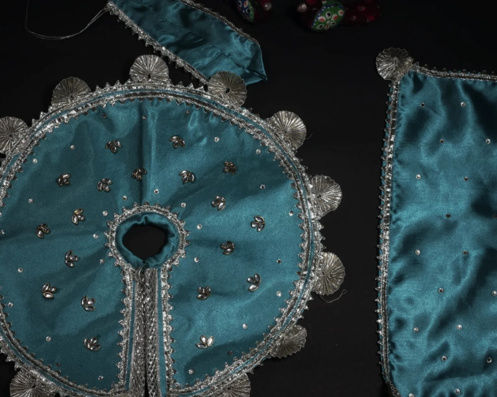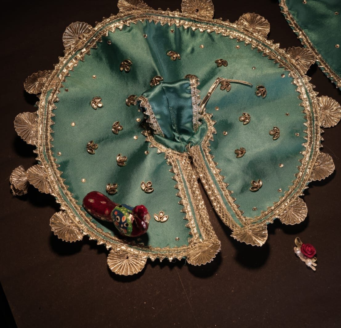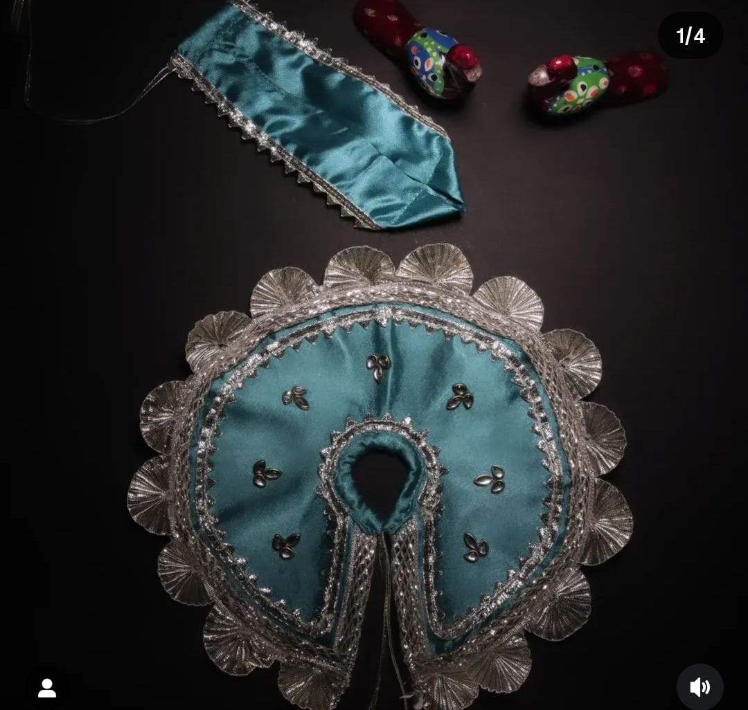 This Teal Silver-Zari Laddu Gopal and shree ji poshak Set includes a satin poshak— perfect for Janmashtami, Ekadashi, daily darshan, or gifting.